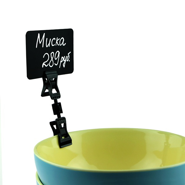 Универсальный ценникодержатель с прищепками, малый надевается на торец полки, край коробки, корзины, блюда, толщиной до 10 мм.