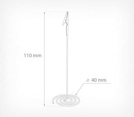 Хромированный держатель ценника устанавливается на любые горизонтальные поверхности. Имеет основание в виде спирали. Зажим прищепка позволяет закрепить вставку толщиной до 5 мм и весом до 5 г.