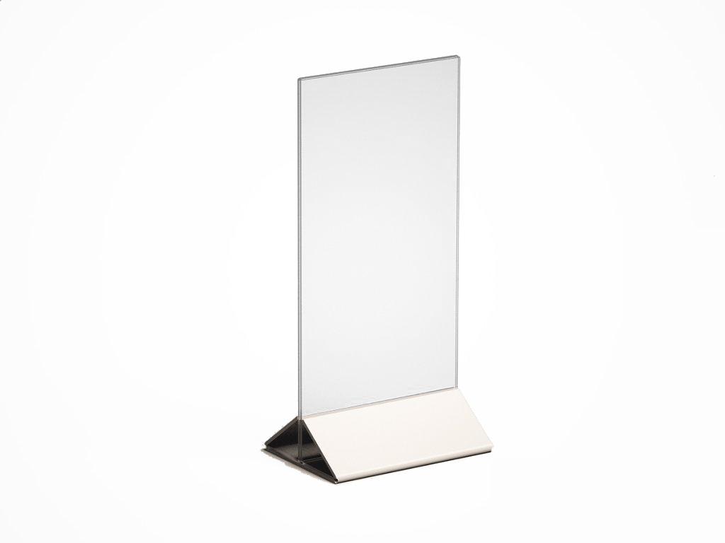 МЕНЮХОЛДЕР ФОРМАТА 1/3 А-4, С НИЖНЕЙ ЧАСТЬЮ РАЗЛИЧНЫХ ЦВЕТОВ, КЛАСИЧЕСКОГО ВИДА. СОСТОИТ ИЗ ДВУХ ЧАСТЕЙ, ПРОЗРАЧНОГО Т-ОБРАЗНОГО ПЛАНШЕТА И НИЖНЕГО ДЕРЖАТЕЛЯ, ТРЕУГОЛЬНОЙ ФОРМЫ. ВОЗМОЖНО НАНЕСЕНИЕ ЛОГОТИПА.