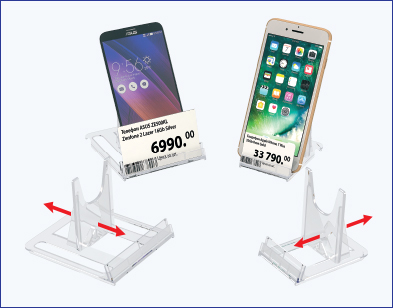 Универсальная сборная подставка под товар идеальна для смартфонов, планшетов, электронных и печатных книг, тарелок и блюд. Применяется в салонах сотовой связи, магазинах электроники и книжных магазинах. Регулируется под разную толщину товара. На переднем крае подставки находится встроенный ценникодержатель. Поставляется в разобранном виде, легко собирается