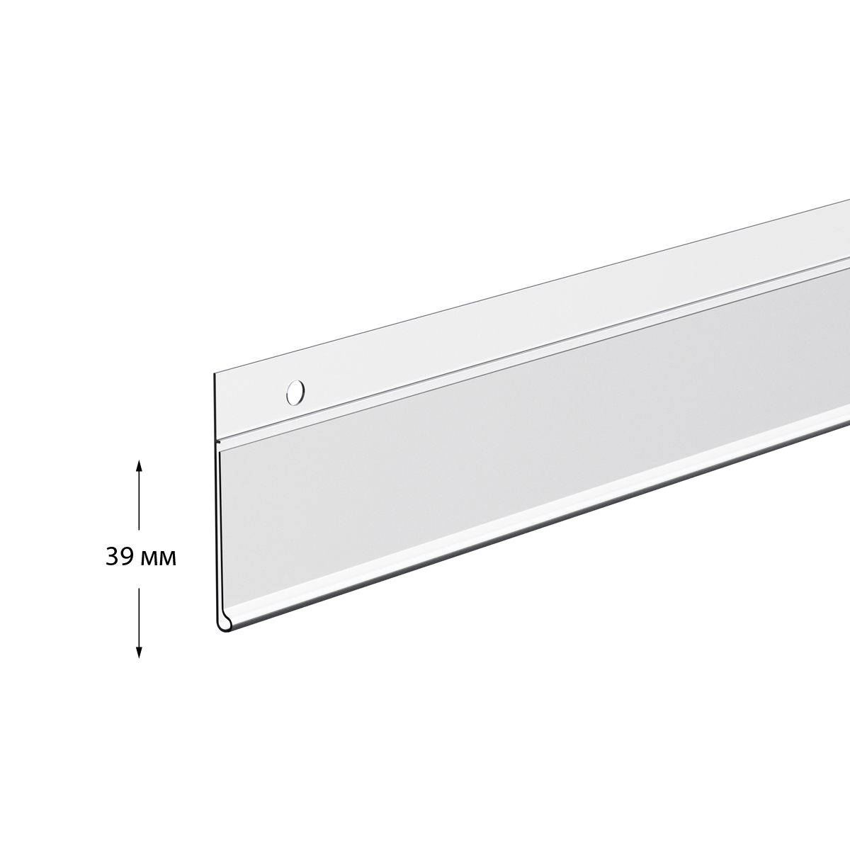 Ценникодержатель DBH39 прозрачного цвета используется для размещения ценников на сетчатом и проволочном торговом оборудовании. Особенности: подвешивается с помощью клипс, высота вставляемого ценника — 39 мм.