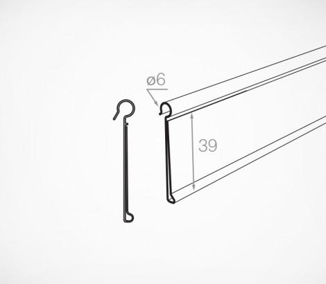 Ценникодержатель DRA применяется на корзинах из металлических прутьев. Защёлкивается на краю проволочной корзины, создавая прочное крепление. тип полок: проволочное оборудование с толщиной проволоки до 6 мм; высота ценника:39 мм Ценникодержатель может использоваться короткими отрезками необходимой длины или в виде длинного профиля, надетого по всей длине края корзины.