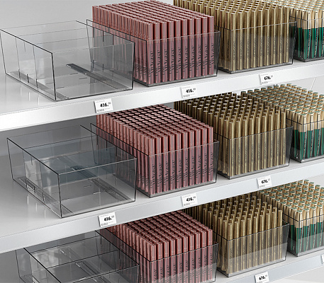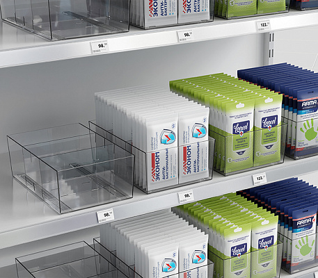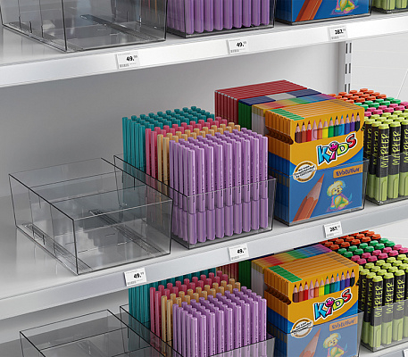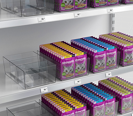 Универсальный накопитель с регулируемыми разделителями идеально подходит для эстетичного размещения фасованных продуктов шириной до 180 мм: упаковок колготок, канцелярии, товаров для животных, косметики и т.п.