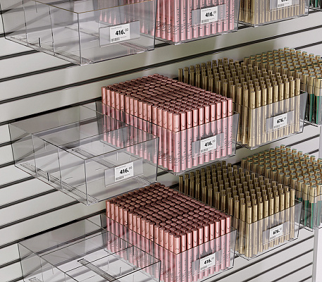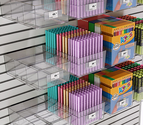 Рифленое дно предотвращает скольжение товара, а прозрачный пластик отлично презентует товар со всех сторон. На лицевой панели могут крепиться самоклеящиеся ценникодержатели. Выдерживает нагрузку до 4 кг.