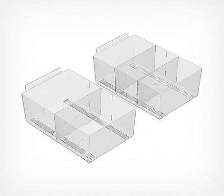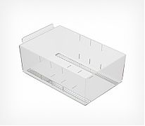 Универсальный накопитель с разделителями подходит для размещения фасованных продуктов, упаковок колготок, канцелярии, товаров для животных, косметики и т.п.